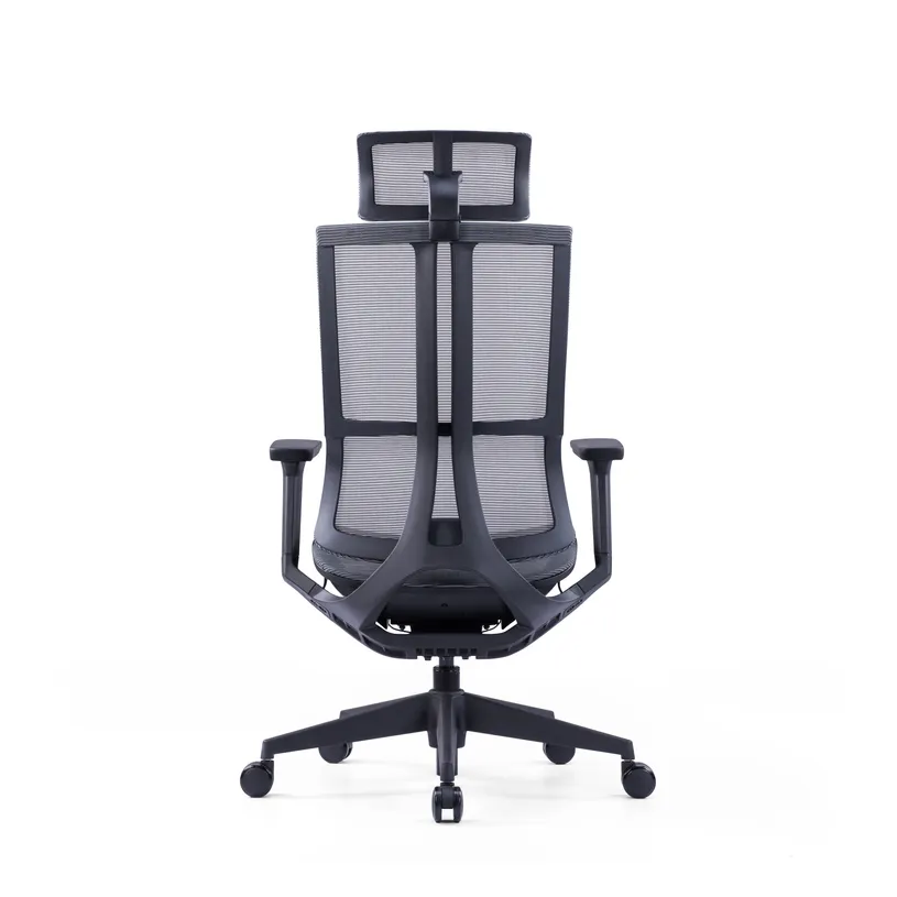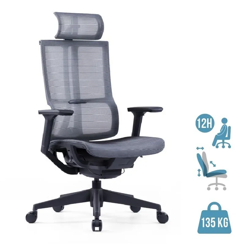 Fauteuil de bureau JAMES offrant réglage de la profondeur d’assise, têtière réglable, renforcement lombaire et dossier multidirectionnel.